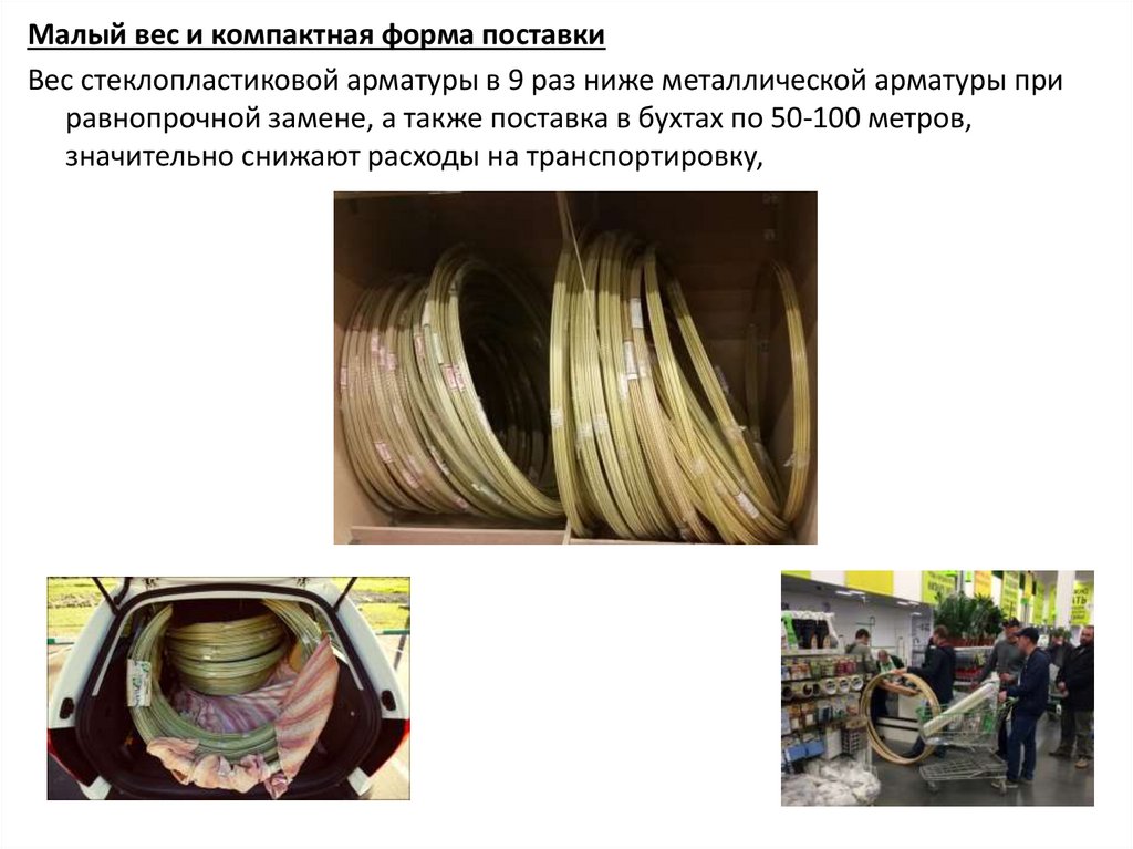 Малый вес и компактная форма поставкиВес стеклопластиковой арматуры в 9 раз ниже металлической арматуры при