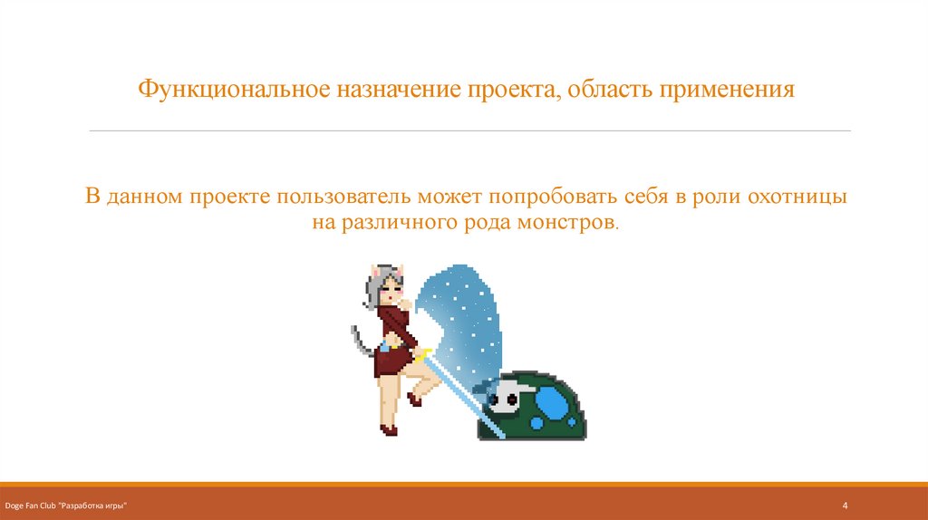 Функциональное назначение проекта, область примененияВ данном проекте пользователь может попробовать себя в роли охотницы