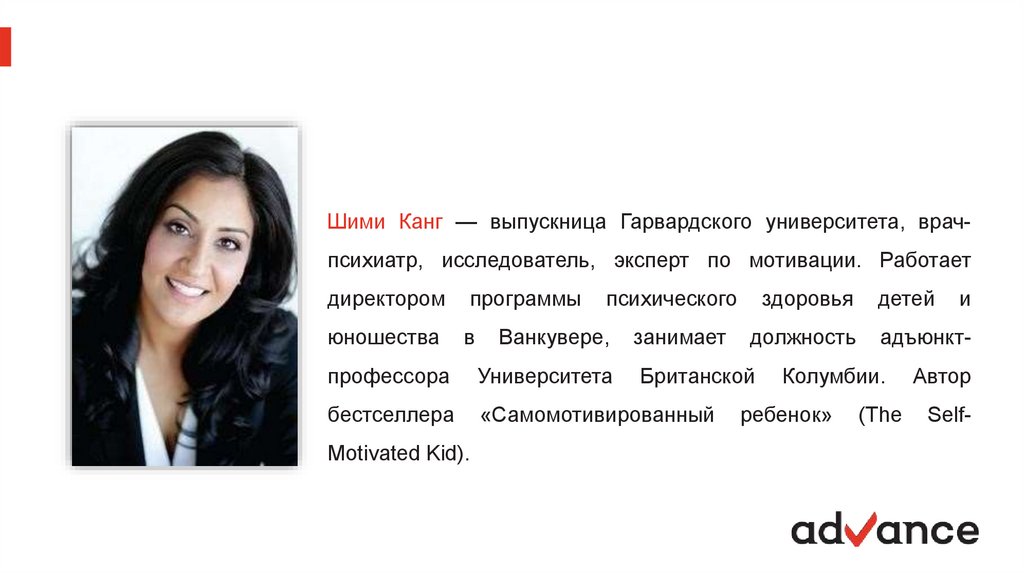 Шими Канг — выпускница Гарвардского университета, врачпсихиатр, исследователь, эксперт по мотивации. Работаетдиректором