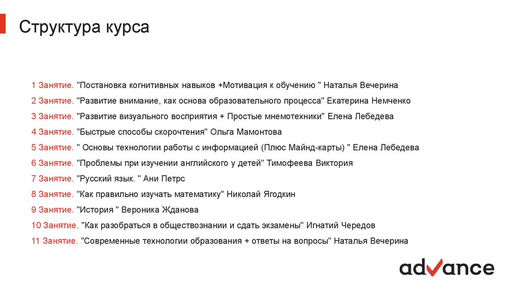 Структура курса1 Занятие. "Постановка когнитивных навыков +Мотивация к обучению " Наталья Вечерина
