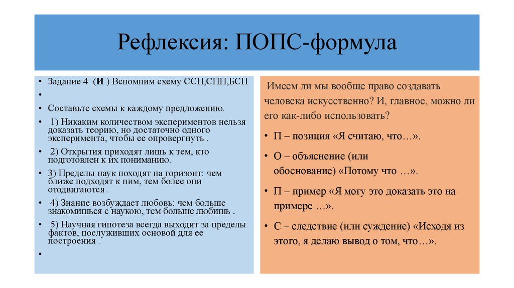 Рефлексия: ПОПС-формула• Задание 4 (И ) Вспомним схему ССП,СПП,БСП