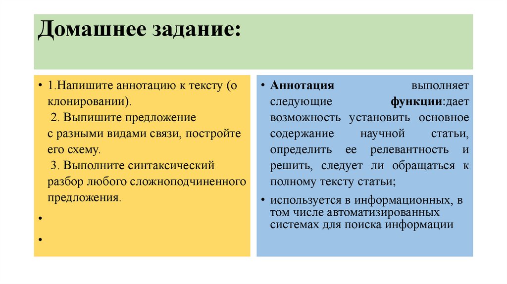Домашнее задание:• 1.Напишите аннотацию к тексту (о