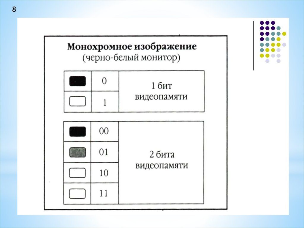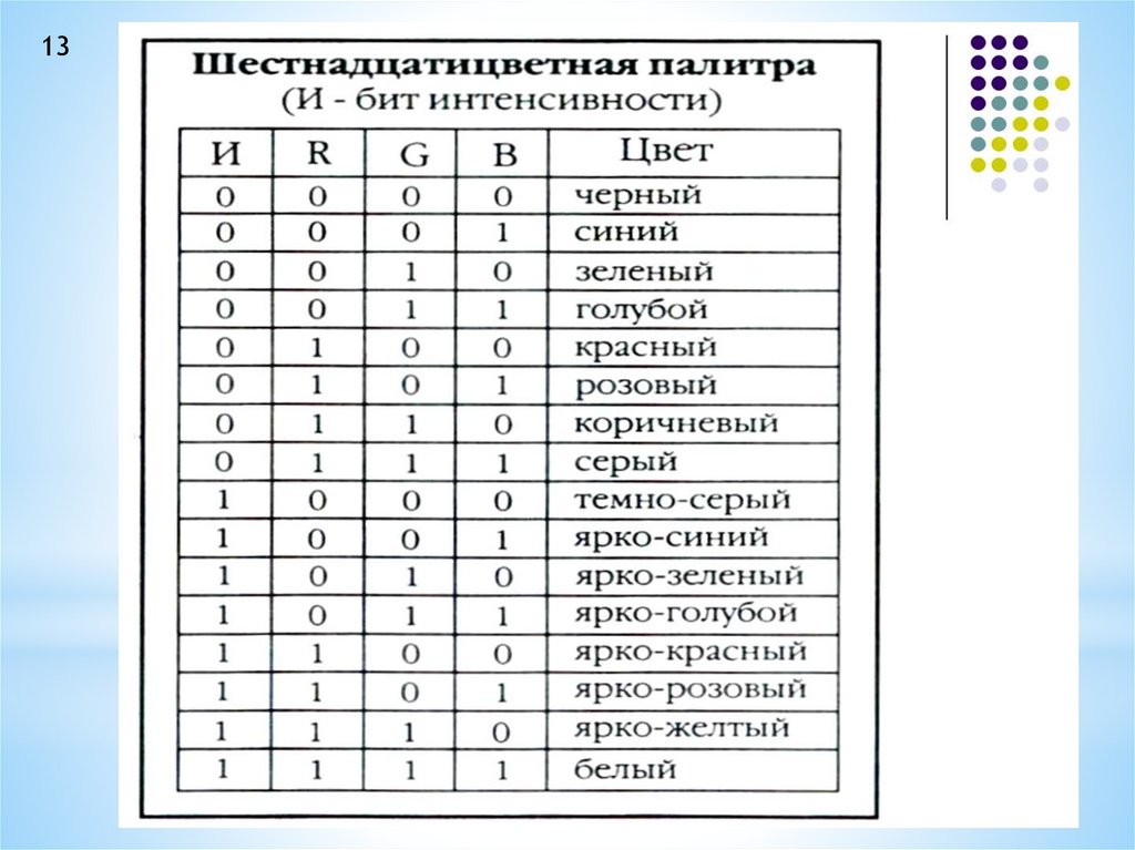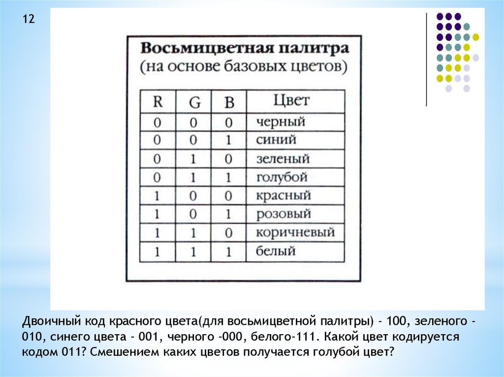 12Двоичный код красного цвета(для восьмицветной палитры) - 100, зеленого 010, синего цвета - 001, черного -000, белого-111. Какой цвет кодируется