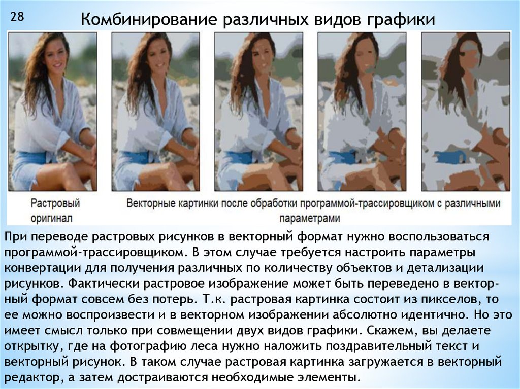 рисунков. Фактически растровое изображение может быть переведено в векторный формат совсем без потерь. Т.к. растровая картинка состоит из пикселов, то