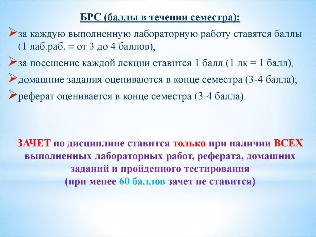 БРС (баллы в течении семестра):за каждую выполненную лабораторную работу ставятся баллы