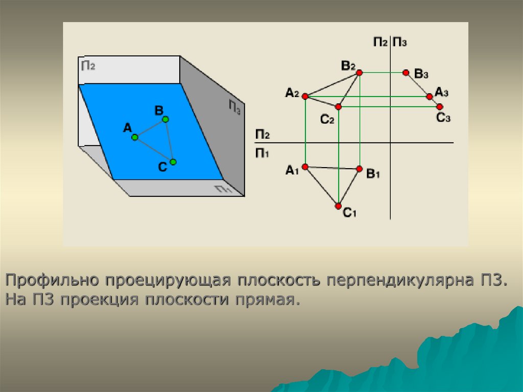 Профильно проецирующая плоскость перпендикулярна П3.На П3 проекция плоскости прямая.
