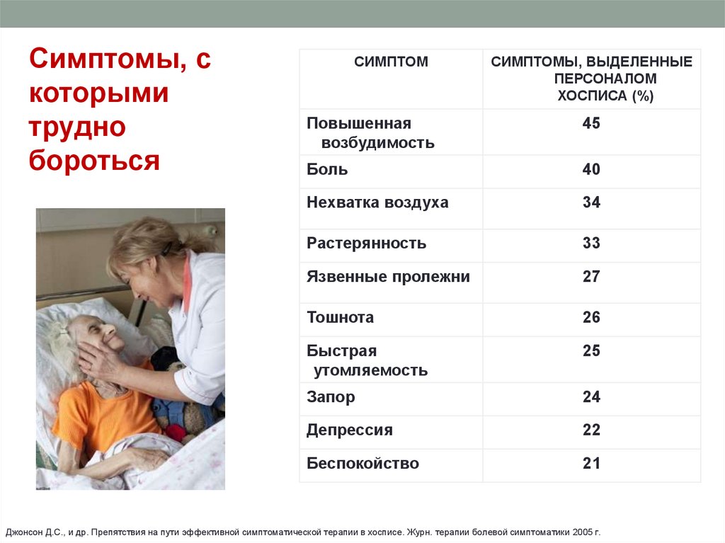 Джонсон Д.С., и др. Препятствия на пути эффективной симптоматической терапии в хосписе. Журн. терапии болевой симптоматики 2005 г.