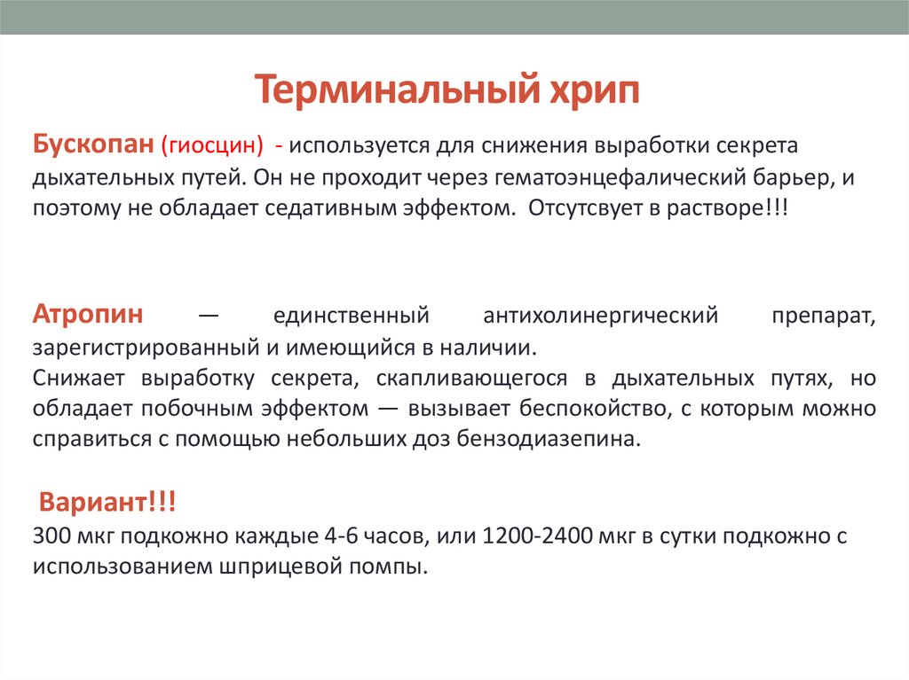 Терминальный хрипБускопан (гиосцин) - используется для снижения выработки секрета