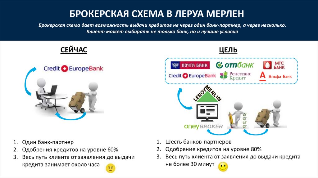 БРОКЕРСКАЯ СХЕМА В ЛЕРУА МЕРЛЕНБрокерская схема дает возможность выдачи кредитов не через один банк-партнер, а через несколько.