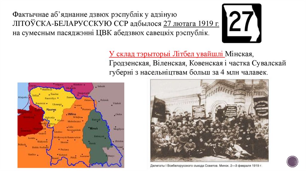 Фактычнае аб’яднанне дзвюх рэспублік у адзінуюЛІТОЎСКА-БЕЛАРУССКУЮ ССР адбылося 27 лютага 1919 г.