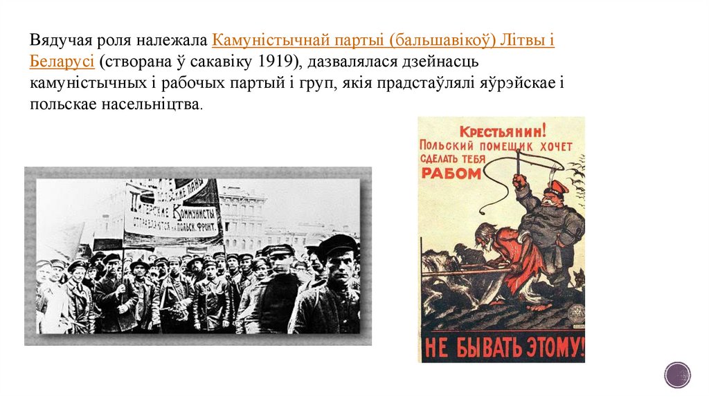 Вядучая роля належала Камуністычнай партыі (бальшавікоў) Літвы іБеларусі (створана ў сакавіку 1919), дазвалялася дзейнасць