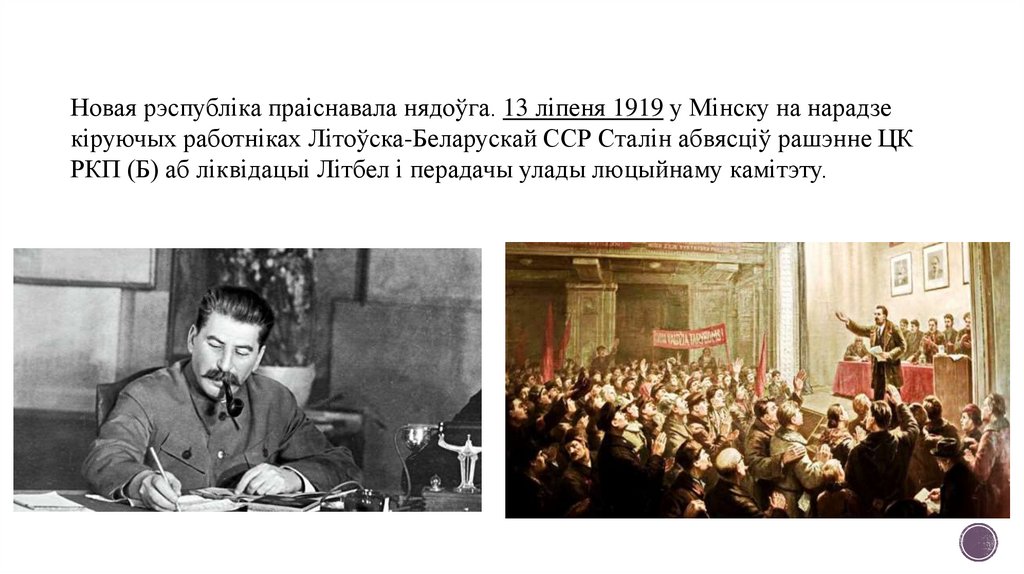 Новая рэспубліка праіснавала нядоўга. 13 ліпеня 1919 у Мінску на нарадзекіруючых работніках Літоўска-Беларускай ССР Сталін абвясціў рашэнне ЦК