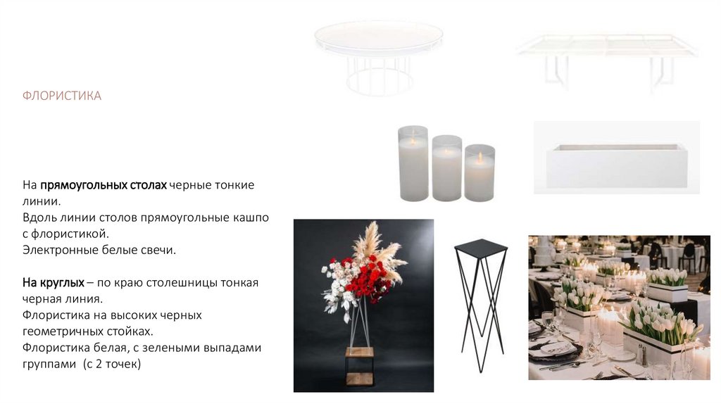 ФЛОРИСТИКАНа прямоугольных столах черные тонкие