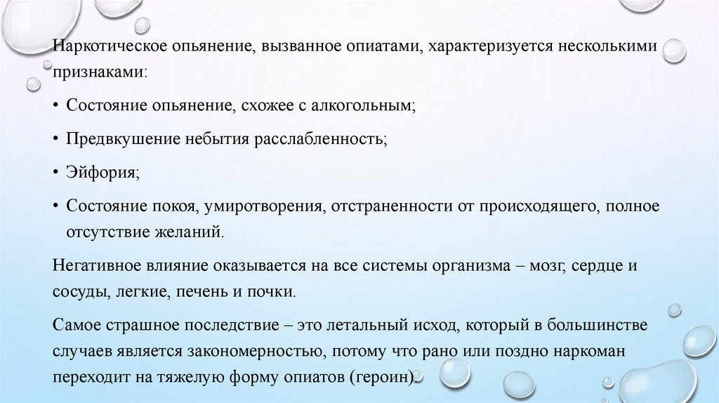 Наркотическое опьянение, вызванное опиатами, характеризуется несколькимипризнаками: