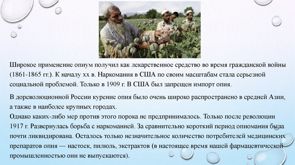 Широкое применение опиум получил как лекарственное средство во время гражданской войны(1861-1865 гг.). К началу xx в. Наркомания в США по своим масштабам стала серьезной