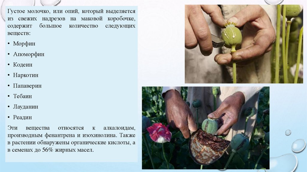 Густое молочко, или опий, который выделяетсяиз свежих надрезов на маковой коробочке,