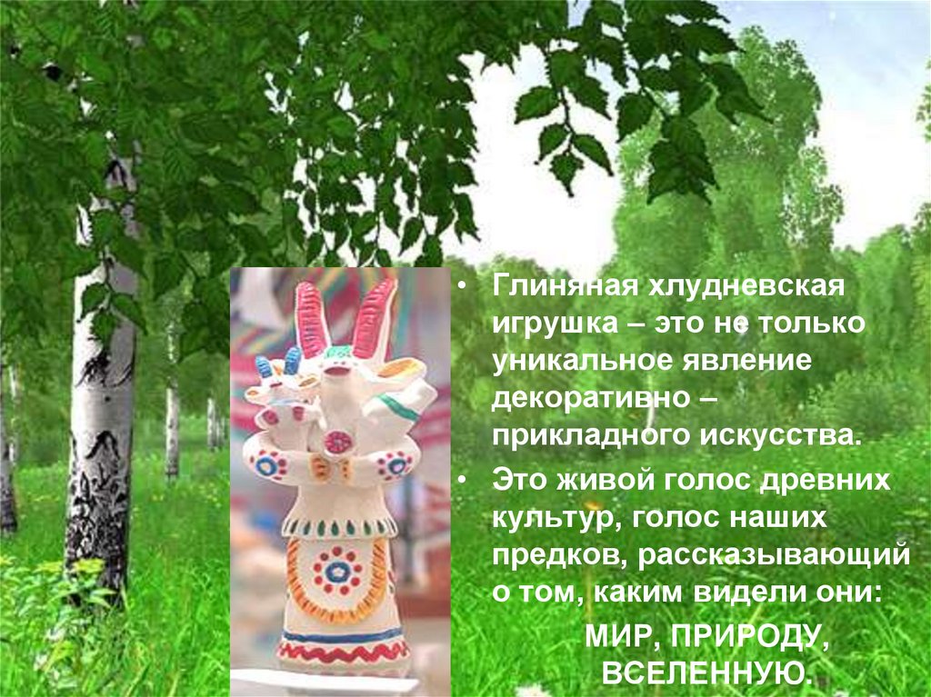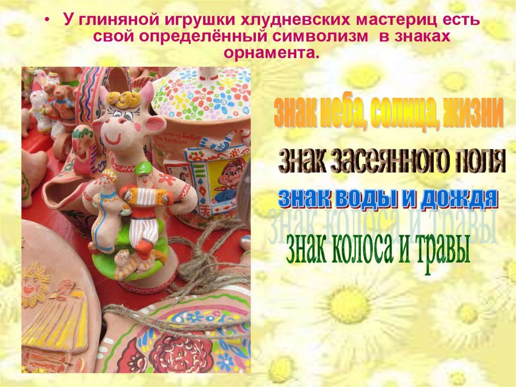 • У глиняной игрушки хлудневских мастериц естьсвой определённый символизм в знаках
