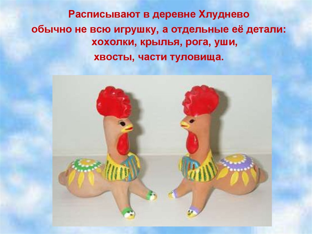 Расписывают в деревне Хлудневообычно не всю игрушку, а отдельные её детали: