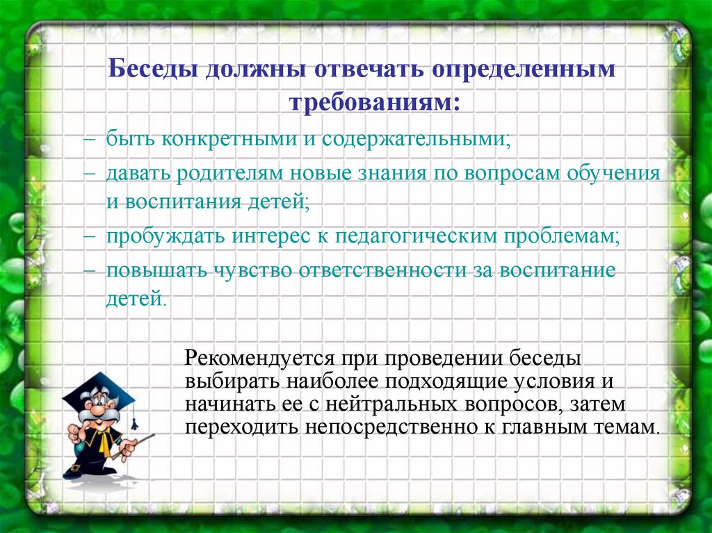 Беседы должны отвечать определеннымтребованиям: