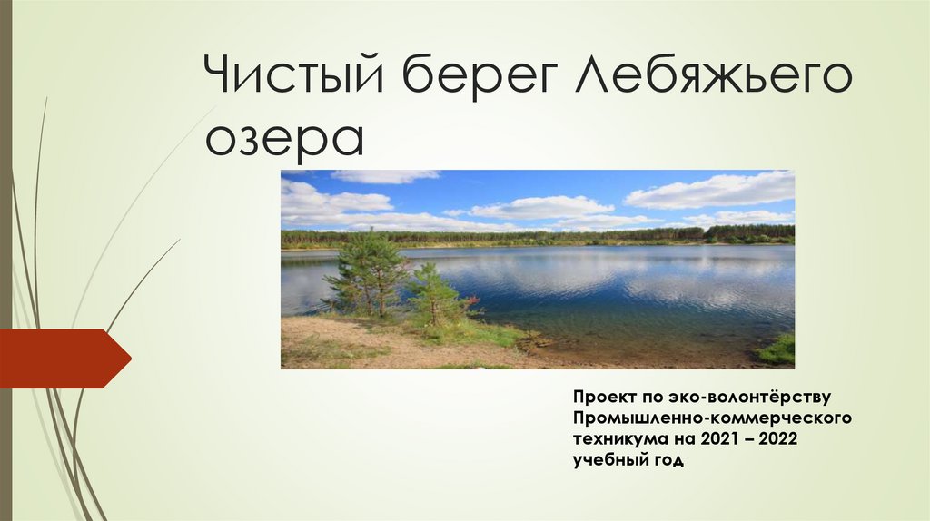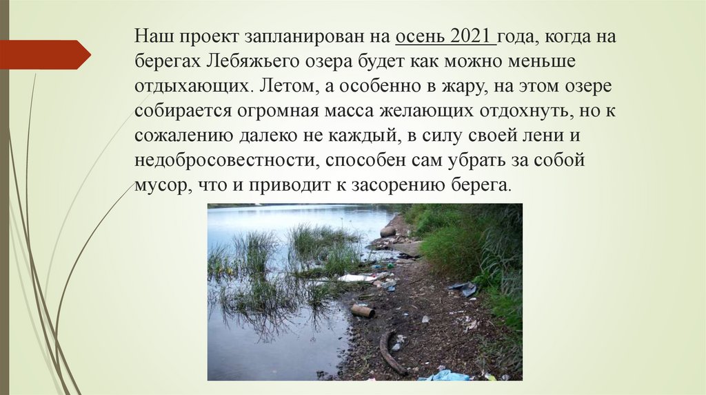 Наш проект запланирован на осень 2021 года, когда наберегах Лебяжьего озера будет как можно меньше