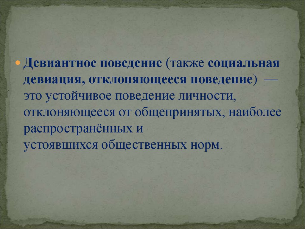 Девиантное поведение (также социальнаядевиация, отклоняющееся поведение) —
