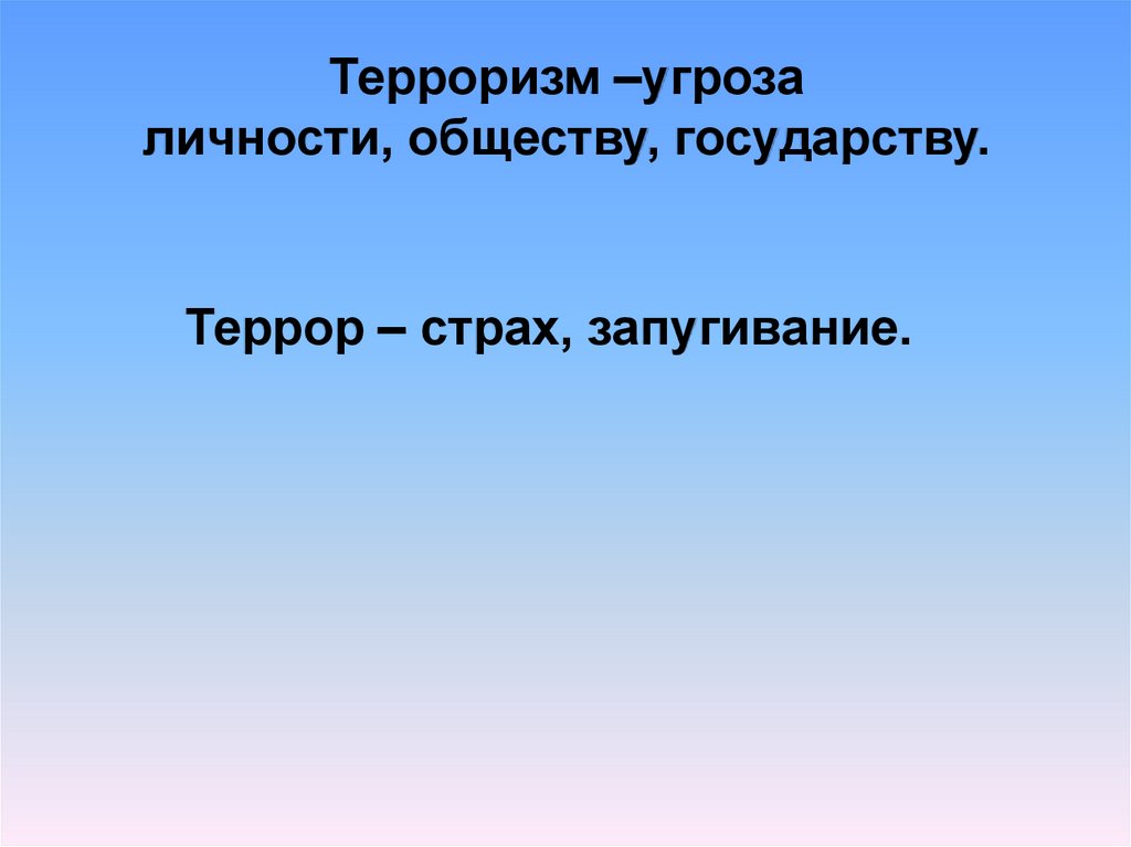 Терроризм –угрозаличности, обществу, государству.