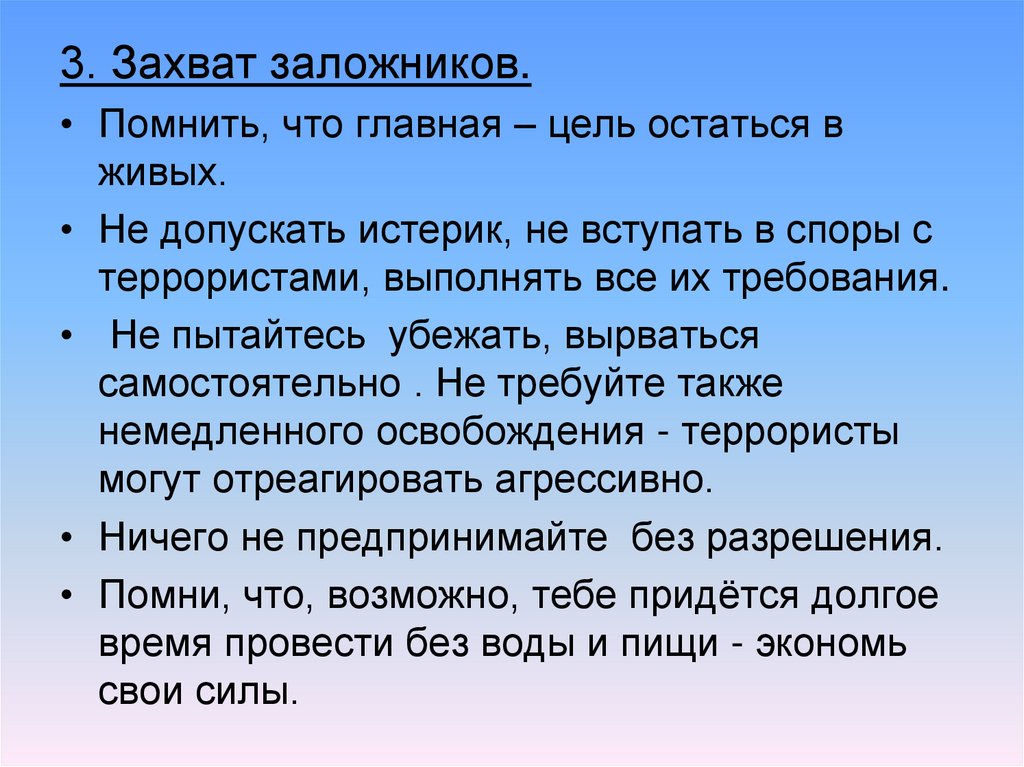 3. Захват заложников.• Помнить, что главная – цель остаться в