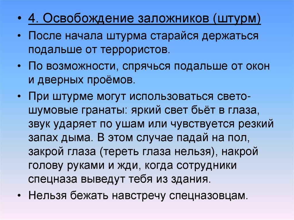 • 4. Освобождение заложников (штурм)• После начала штурма старайся держаться