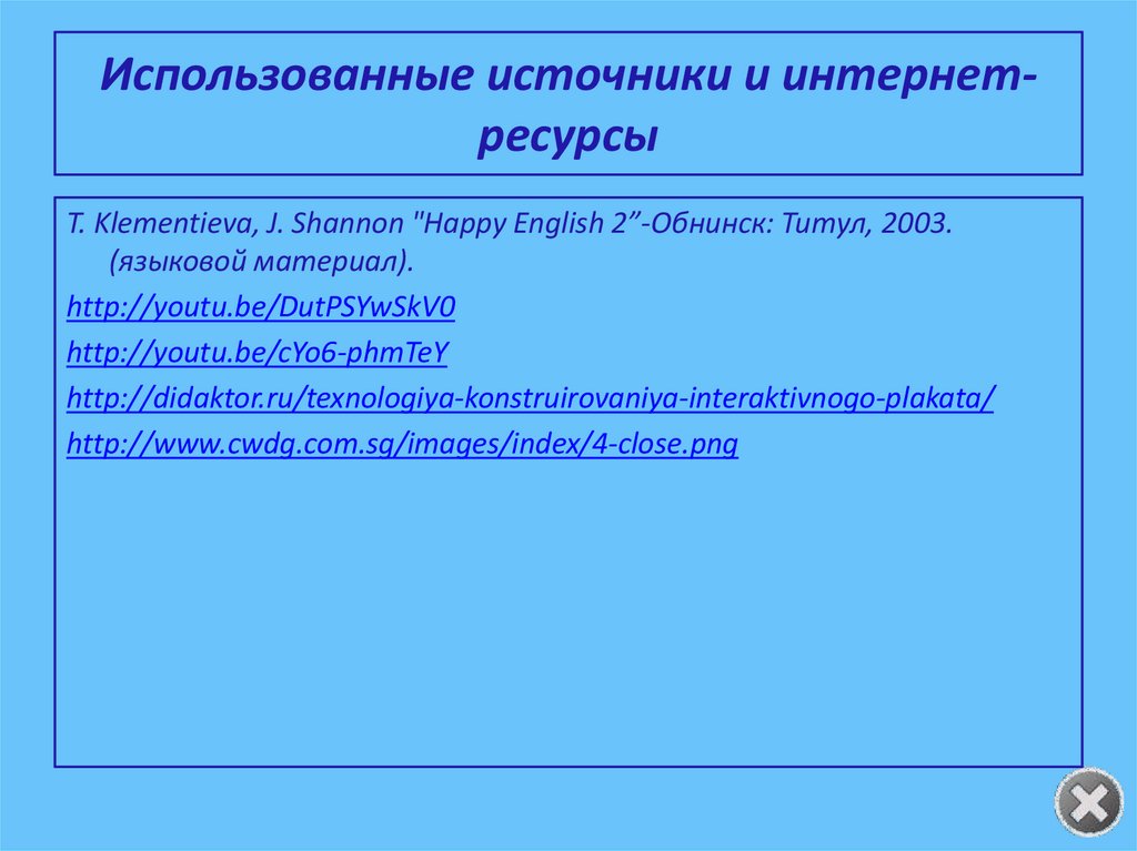 Использованные источники и интернетресурсыT. Klementieva, J. Shannon "Happy English 2”-Обнинск: Титул, 2003.