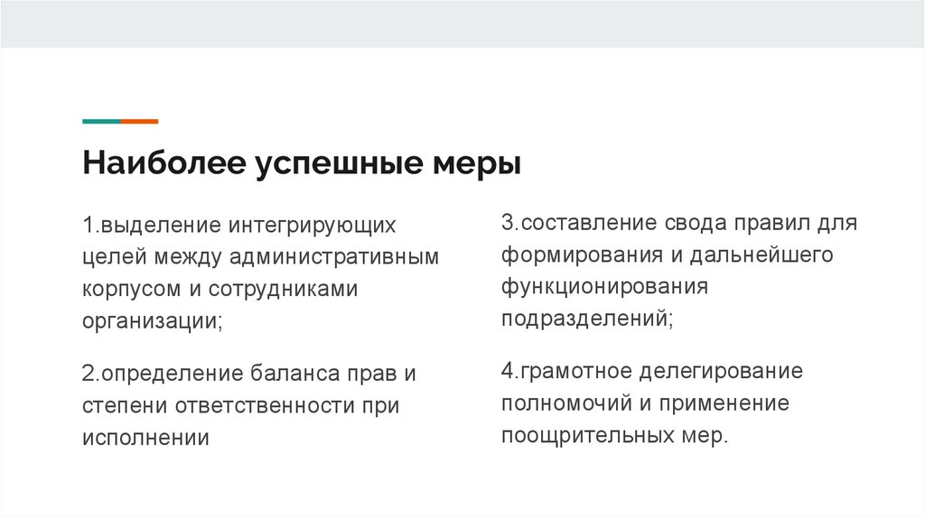 Наиболее успешные меры1.выделение интегрирующих