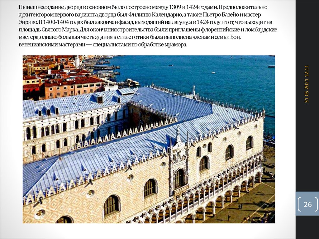Энрико. В 1400-1404 годах был закончен фасад, выходящий на лагуну, а в 1424 году и тот, что выходит на