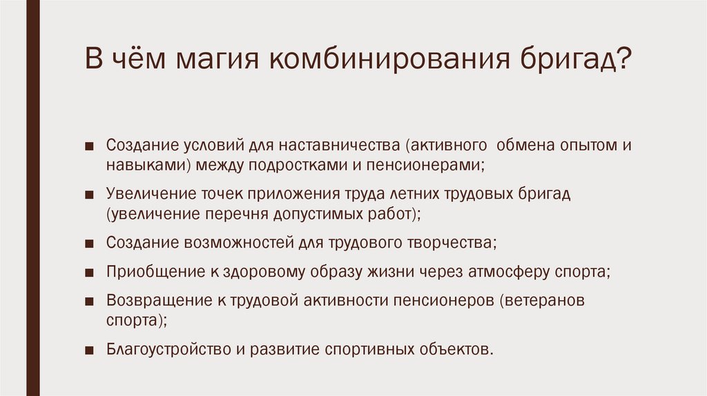В чём магия комбинирования бригад?■ Создание условий для наставничества (активного обмена опытом и