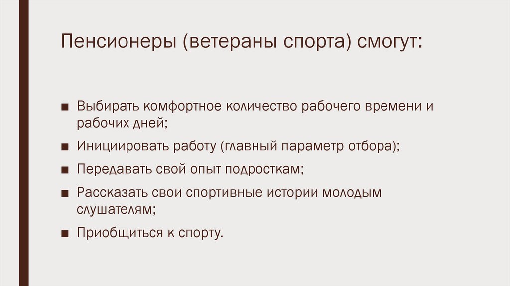 Пенсионеры (ветераны спорта) смогут:■ Выбирать комфортное количество рабочего времени и