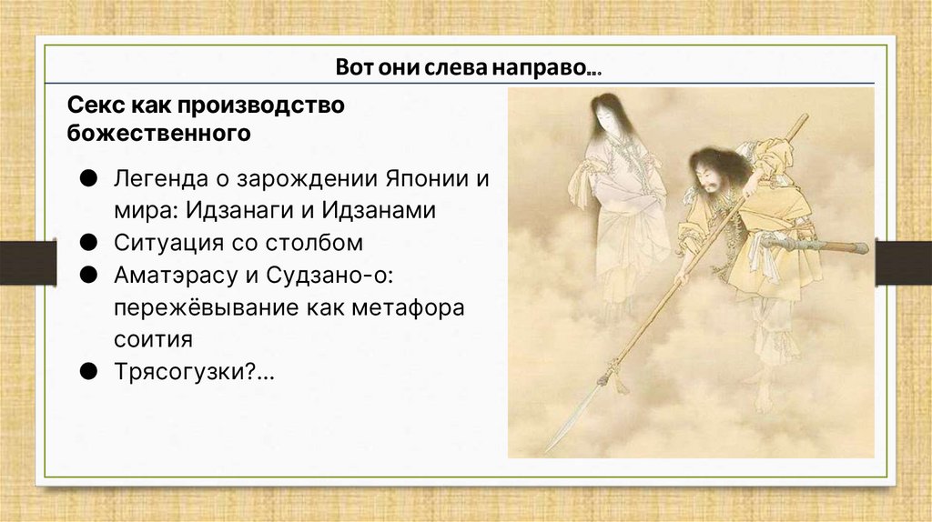 другого]» (яп. 体を重ねる, карада о касанэру), «обнимать» (яп. 抱く, идаку) — заниматься