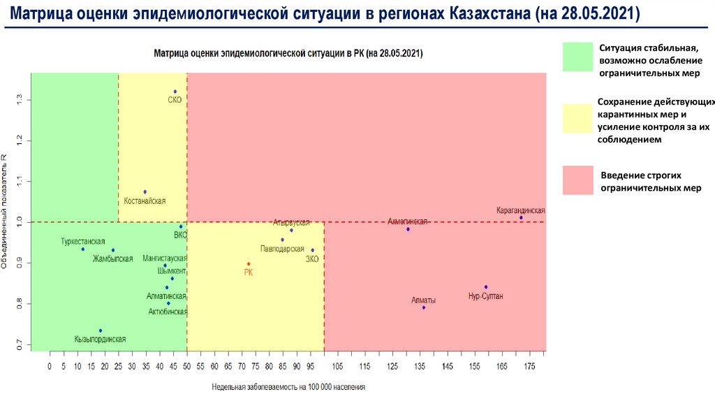 Матрица оценки эпидемиологической ситуации в регионах Казахстана (на 28.05.2021)Ситуация стабильная,