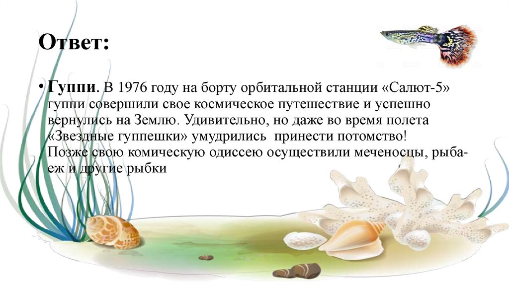 Ответ:• Гуппи. В 1976 году на борту орбитальной станции «Салют-5»