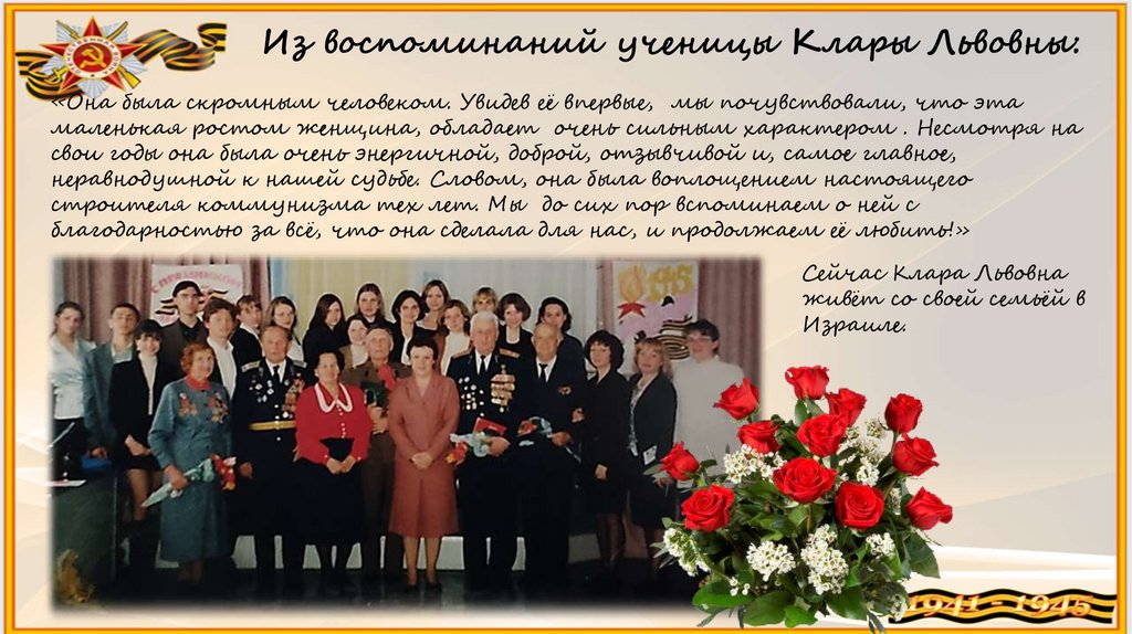 Из воспоминаний ученицы Клары Львовны:«Она была скромным человеком. Увидев её впервые, мы почувствовали, что эта