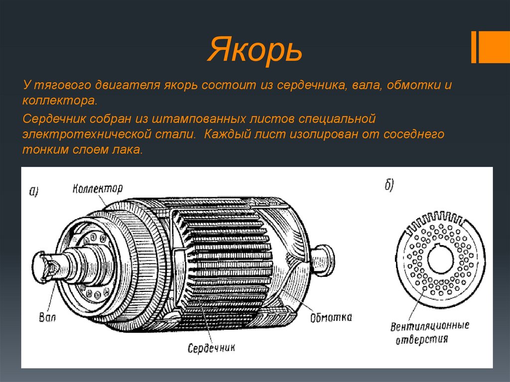 ЯкорьУ тягового двигателя якорь состоит из сердечника, вала, обмотки и