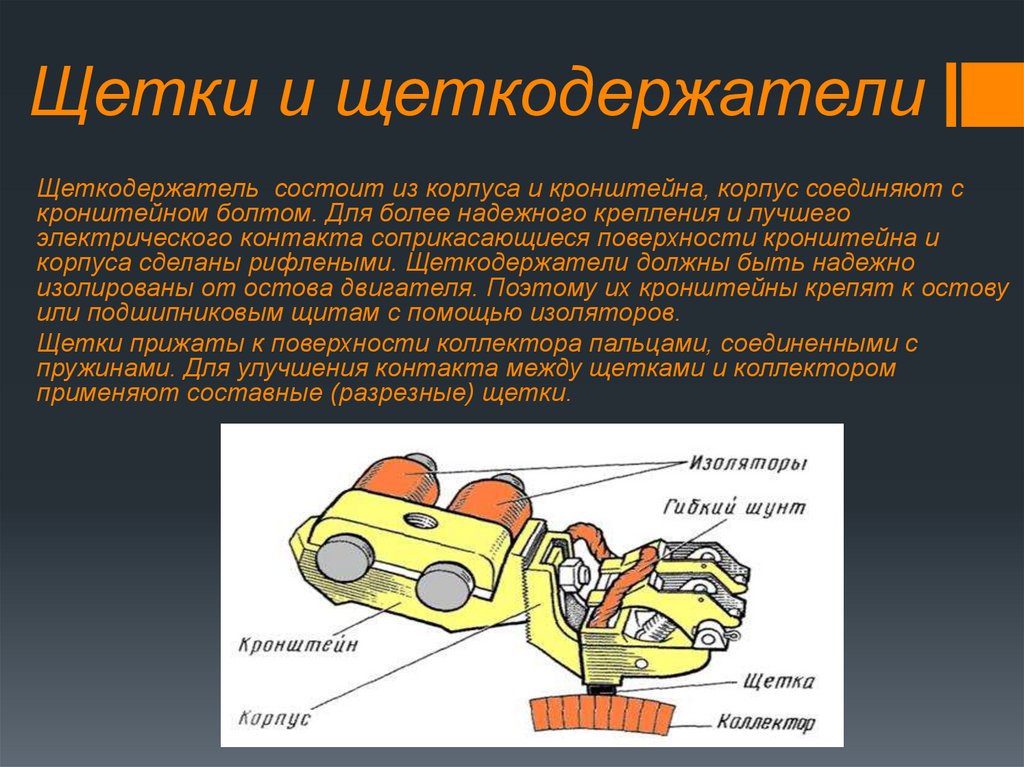Щетки и щеткодержателиЩеткодержатель состоит из корпуса и кронштейна, корпус соединяют с