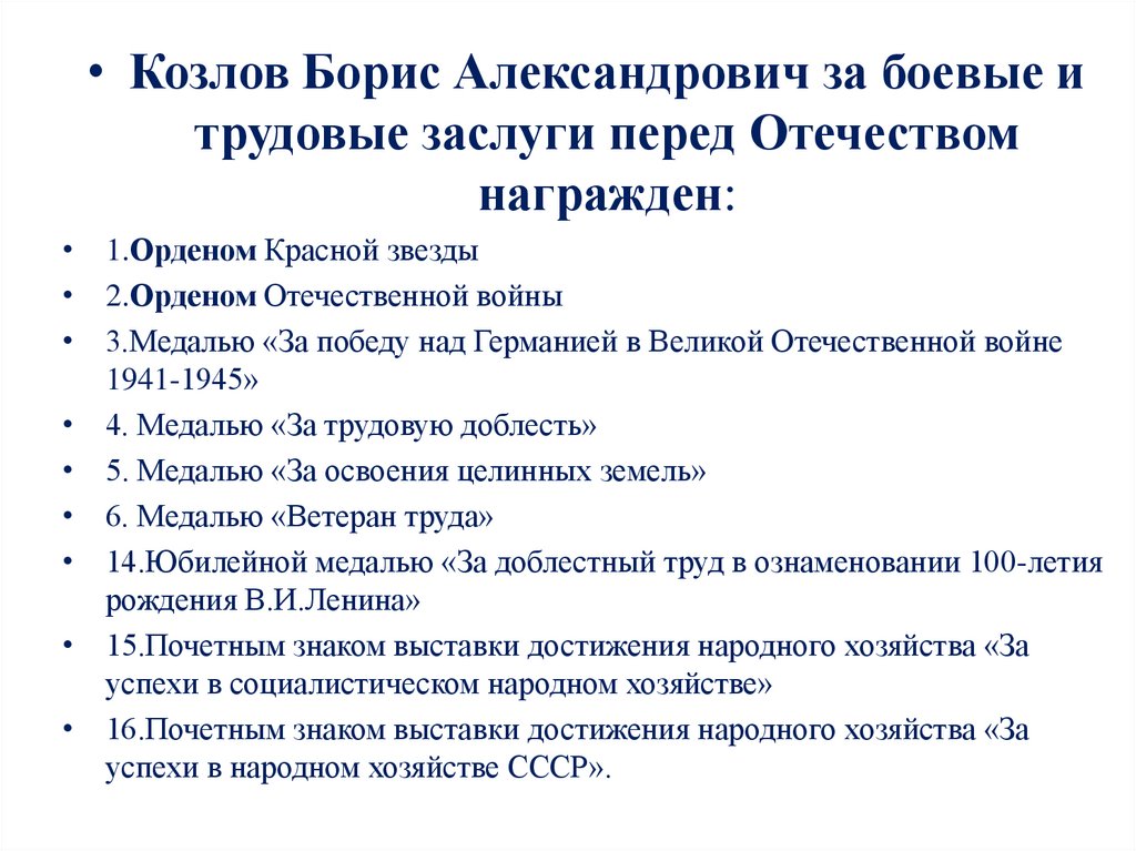 • Козлов Борис Александрович за боевые итрудовые заслуги перед Отечеством