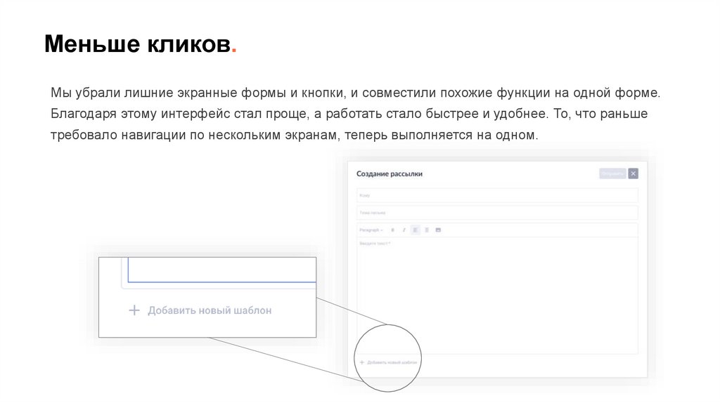 Меньше кликов.Мы убрали лишние экранные формы и кнопки, и совместили похожие функции на одной форме.