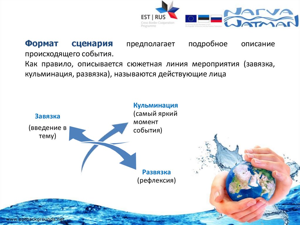 Как правило, описывается сюжетная линия мероприятия (завязка,