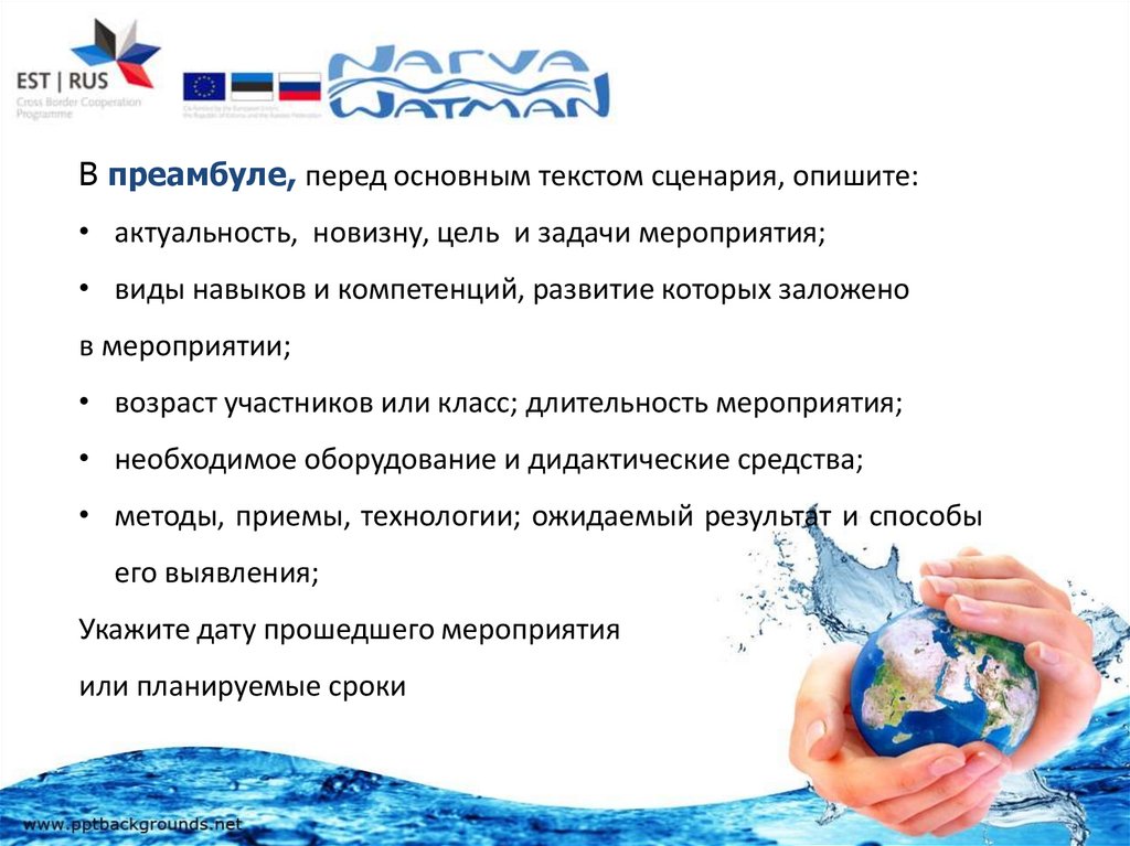 В преамбуле, перед основным текстом сценария, опишите:• актуальность, новизну, цель и задачи мероприятия;
