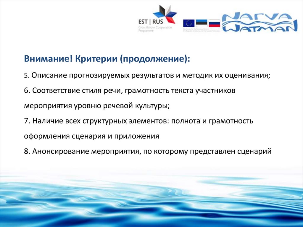 Внимание! Критерии (продолжение):5. Описание прогнозируемых результатов и методик их оценивания;