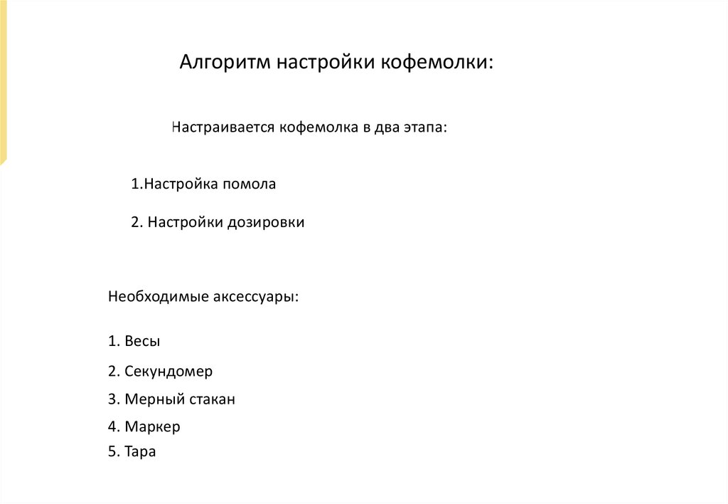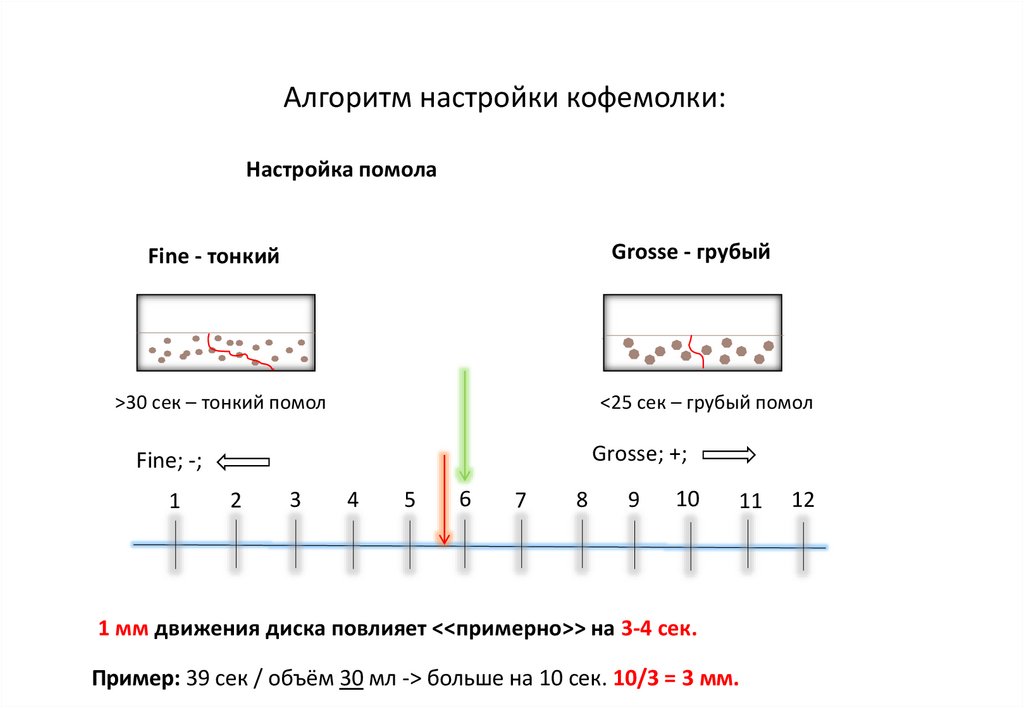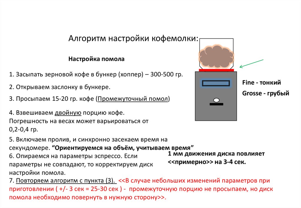 Алгоритм настройки кофемолки:Настраивается кофемолка в два этапа: