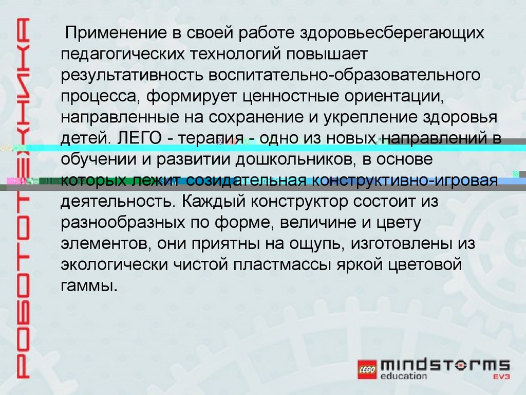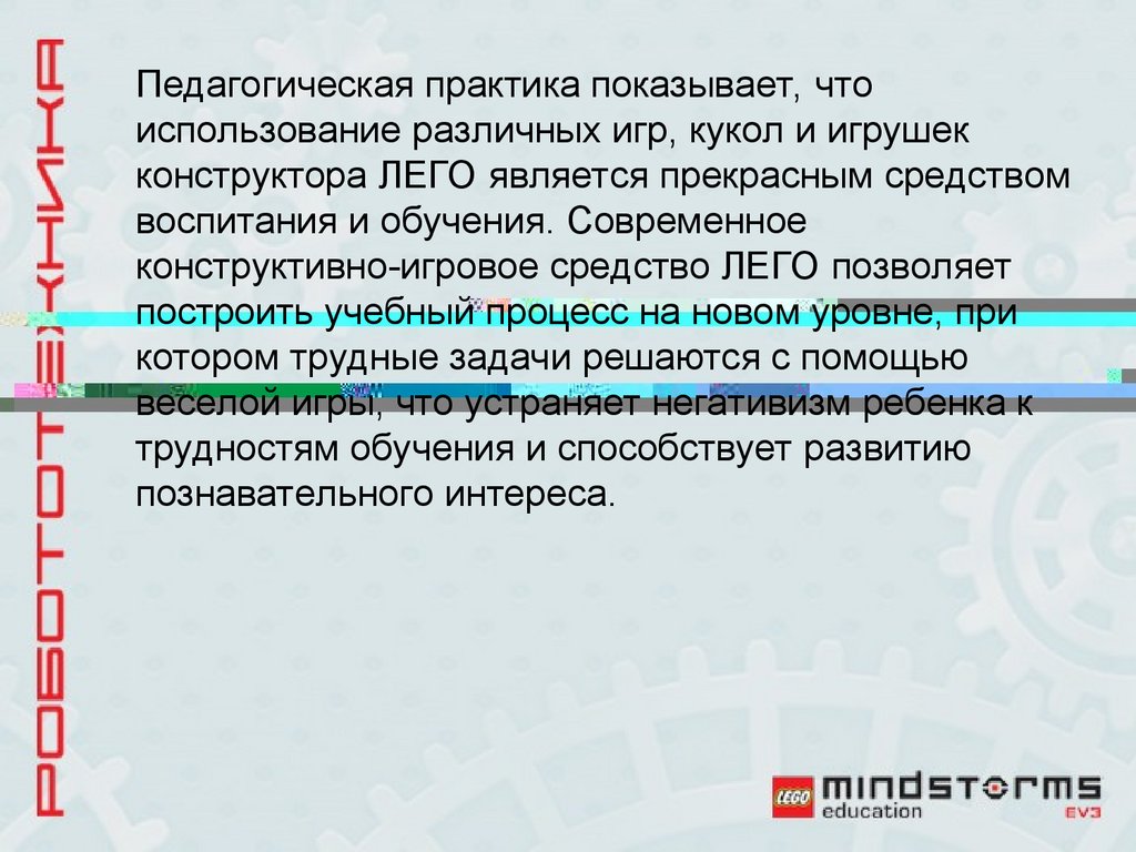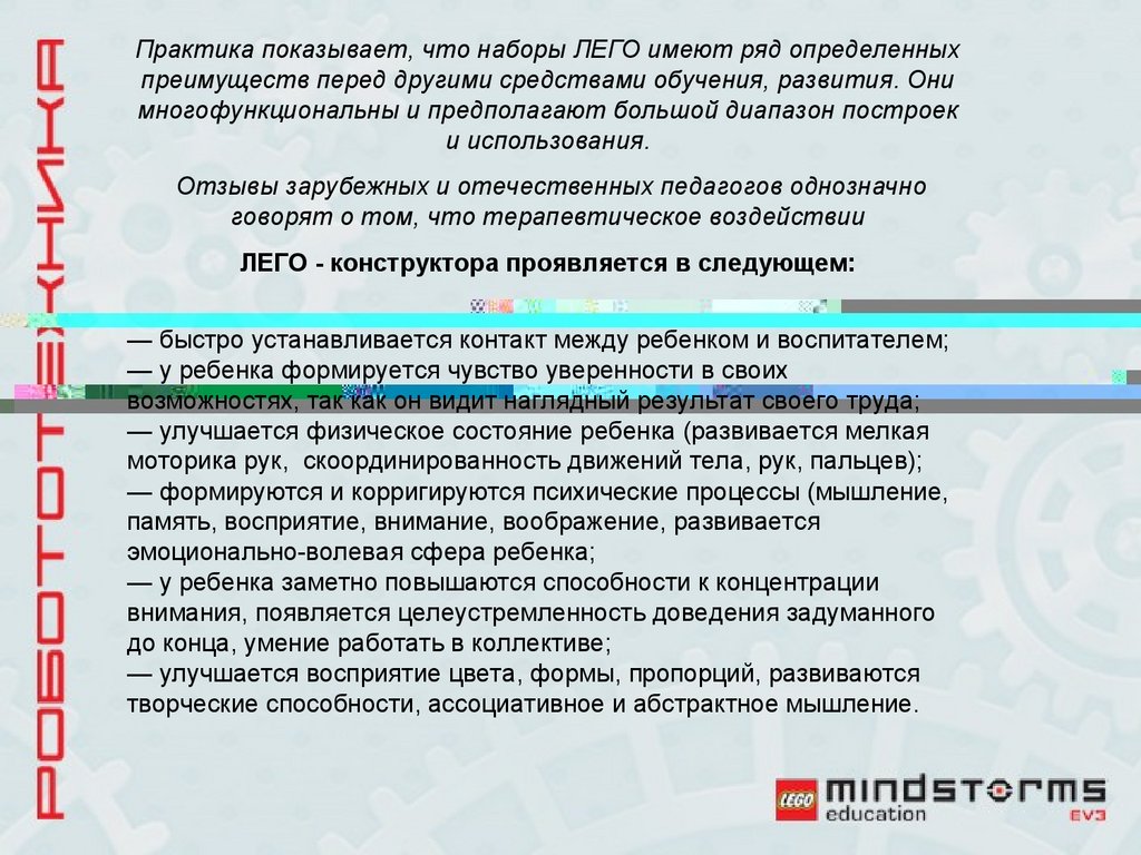 Практика показывает, что наборы ЛЕГО имеют ряд определенныхпреимуществ перед другими средствами обучения, развития. Они