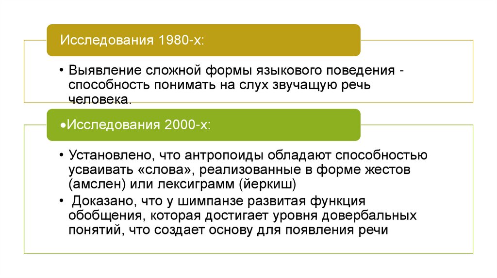 Исследования 1980-х:• Выявление сложной формы языкового поведения способность понимать на слух звучащую речь