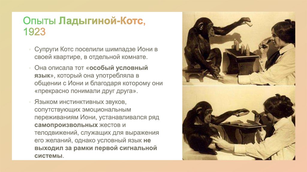 Опыты Н. Н. Ладыгиной-Котс (1923):