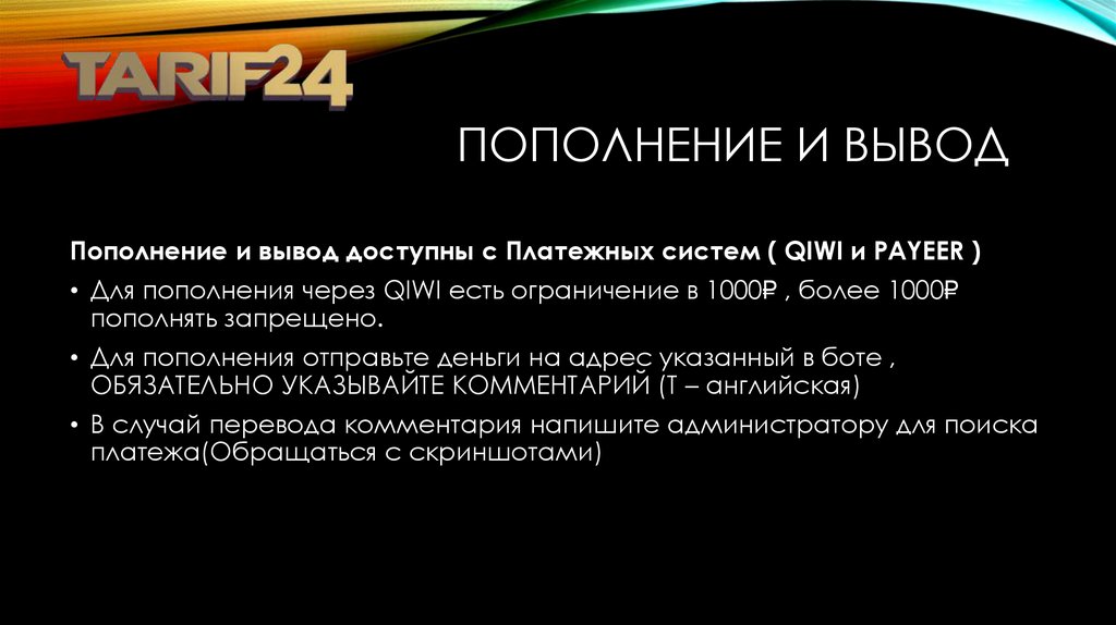 • Для пополнения отправьте деньги на адрес указанный в боте ,