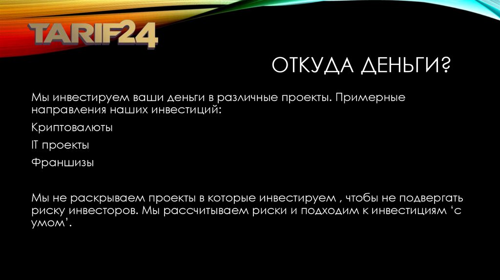 ОТКУДА ДЕНЬГИ?Мы инвестируем ваши деньги в различные проекты. Примерные